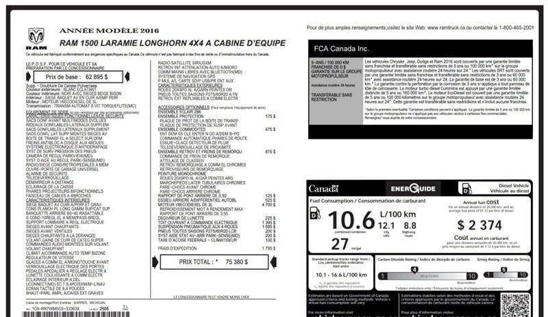 - Laramie Quick Order Package 28K Longhorn EditionIncludes vehicle with standard equipment, 3.0L V6 turbocharged diesel engine rated at 240hp @ 3,600 rpm and 420ft. lbs. of torque at 2,000 rpm, 3.0L diesel badge, 3.55 axle ratio, 230 amp alternator, 26 gallon fuel tank, 800 amp maintenance free battery, GVW rating of 6,950 lbs., maximum duty engine cooling, next generation engine controller,selective catalytic reduction, 8-speed shiftable automatic transmission, active grille shutters, electronic shift, and tip start.